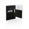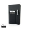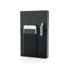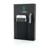 A5 notebook with 160 cream coloured lined pages of 80g/m2 paper inside. Front cover has a flexible phone pocket, pen pocket and larger sleeve pocket for documents. Phone pocket is 8cm wide which fits iPhone 7 plus.