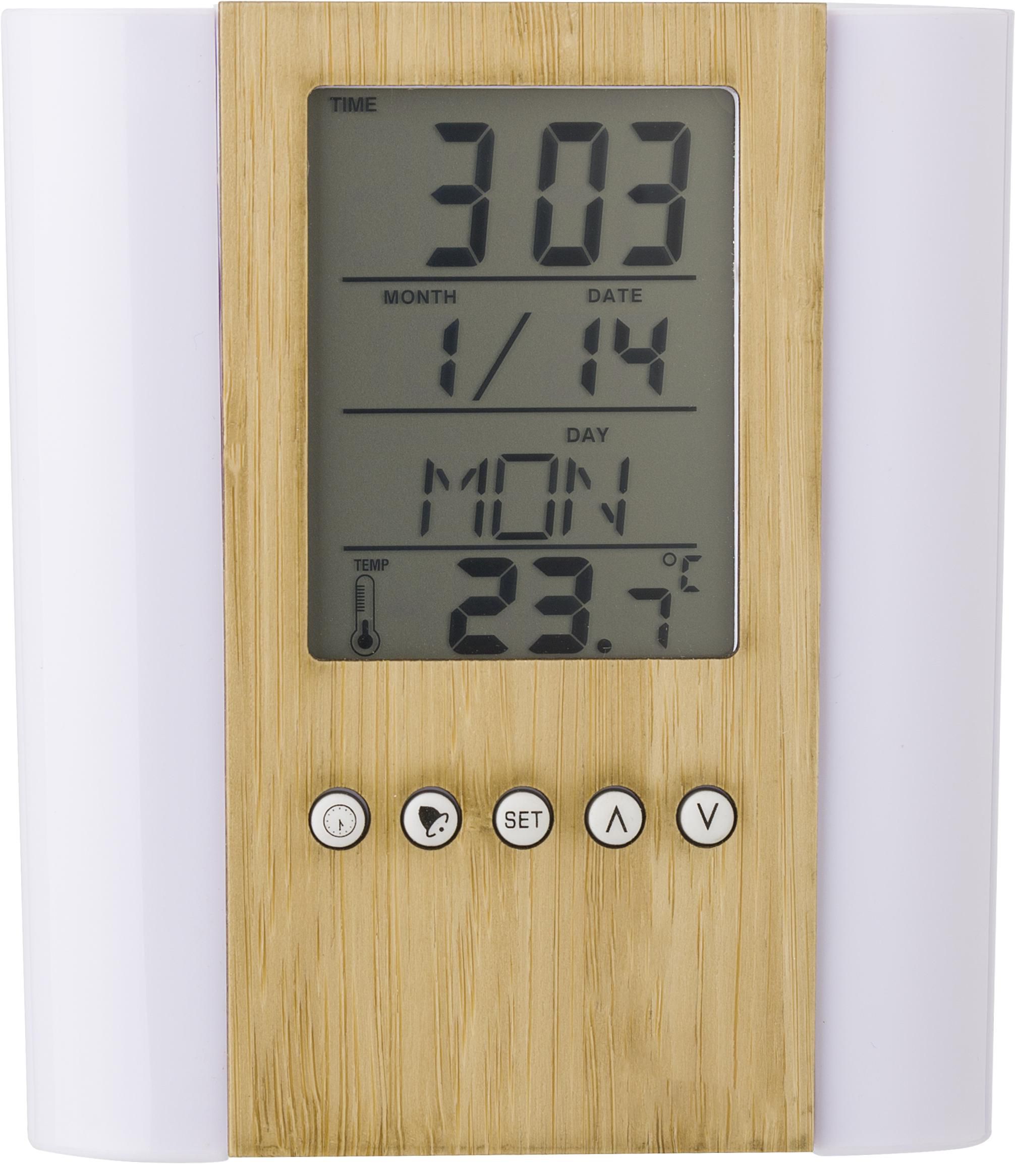 Držač za olovke od bambusa i plastike s višenamjenskim satom. Funkcije: vrijeme, unutarnji termometar, kalendar (dan, datum, mjesec), alarm i odgoda alarma, timer i podsjetnik za rođendan. Baterije uključene.