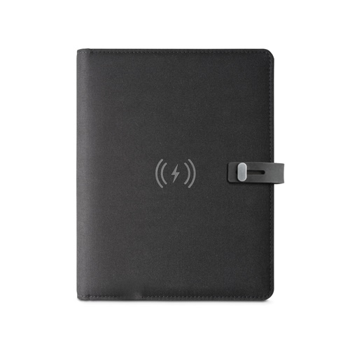 300D recikliranog poliestera (100% rPET) A5 mapa s ugrađenim bežičnim punjačem. Baterija ima kapacitet od 5’000 mAh, 5 W snage, 5V/2’1A ulaz/izlaz i USB tip C kabel za punjenje. U fascikli se nalazi džep za pametni telefon za uređaj do 6.5”, 3 utora za kartice, 4 LED svjetla, gumb za uključivanje/isključivanje, držač kemijske olovke (nije uključen), pametni telefon i USB kabel, bilježnicu s crnim kartonskim poklopcem i 128 stranica boje slonovače(75 g/m²), izrađen od FSC™ certificiranog materijala i drugih kontroliranih materijala. S prednje strane također se nalazi ovalni ispis u crnoj boji koji označava područje bežičnog punjenja. Isporučuje se u kutiji. 165 x 225 x 25 mm