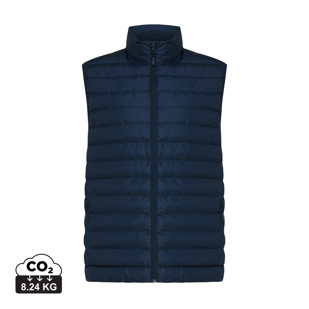 Muški prsluk srednjeg kroja izrađen od 100% recikliranog poliestera. Prsluk je u potpunosti prošiven punjenjem od 100% recikliranog poliestera s bisernim uzorkom. Ima obrnuti patentni zatvarač sprijeda i praktične džepove s patentnim zatvaračem u bočnim šavovima. Svi patentni zatvarači imaju dodatne povlačeće kopče u odgovarajućoj boji za profinjen izgled. Otvori za ruke imaju elastični rub, a svi šavovi s unutarnje strane su glatko završeni recikliranim rubom. Impregnacija je vodoodbojna bez fluora/PFAS-a. Upotreba originalnih recikliranih tkanina i tvrdnje o utjecaju na okoliš zajamčene su korištenjem AWARE™ disruptivnog fizičkog tragača i blockchain tehnologije. Skeniranjem QR koda dobit ćete pristup namjenskoj digitalnoj putovnici. 2% prihoda od svakog prodanog proizvoda bit će donirano Water.org-u. Ovaj proizvod ima OEKO-TEX® STANDARD 100 certifikat. Meru prsluk dostupan je i u ženskoj varijanti.
