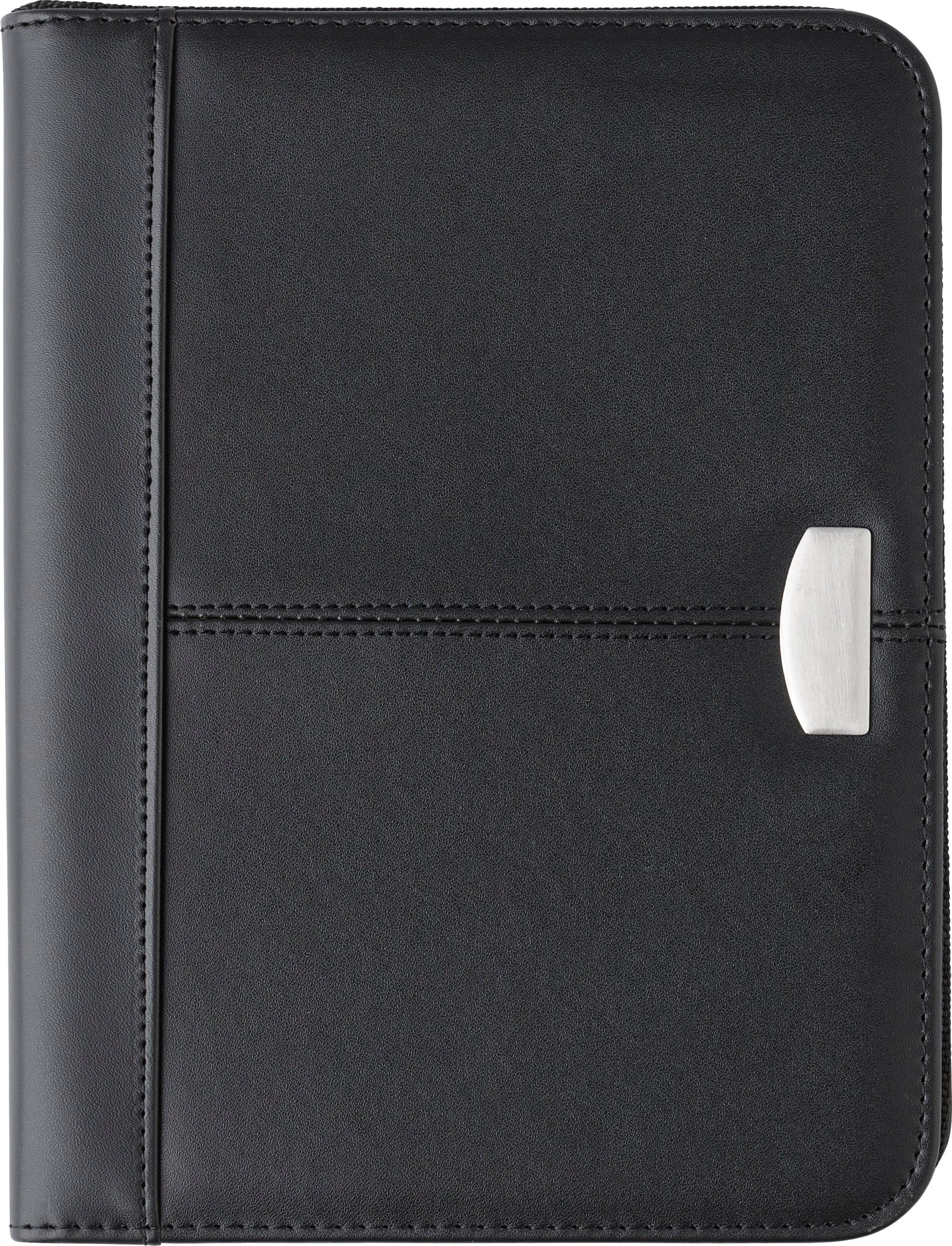 Kožna mapa za konferencije s patentnim zatvaračem (otprilike A5), s notesom s 25 stranica, različitim džepovima i elastičnom omčom za olovku (olovka nije uključena).