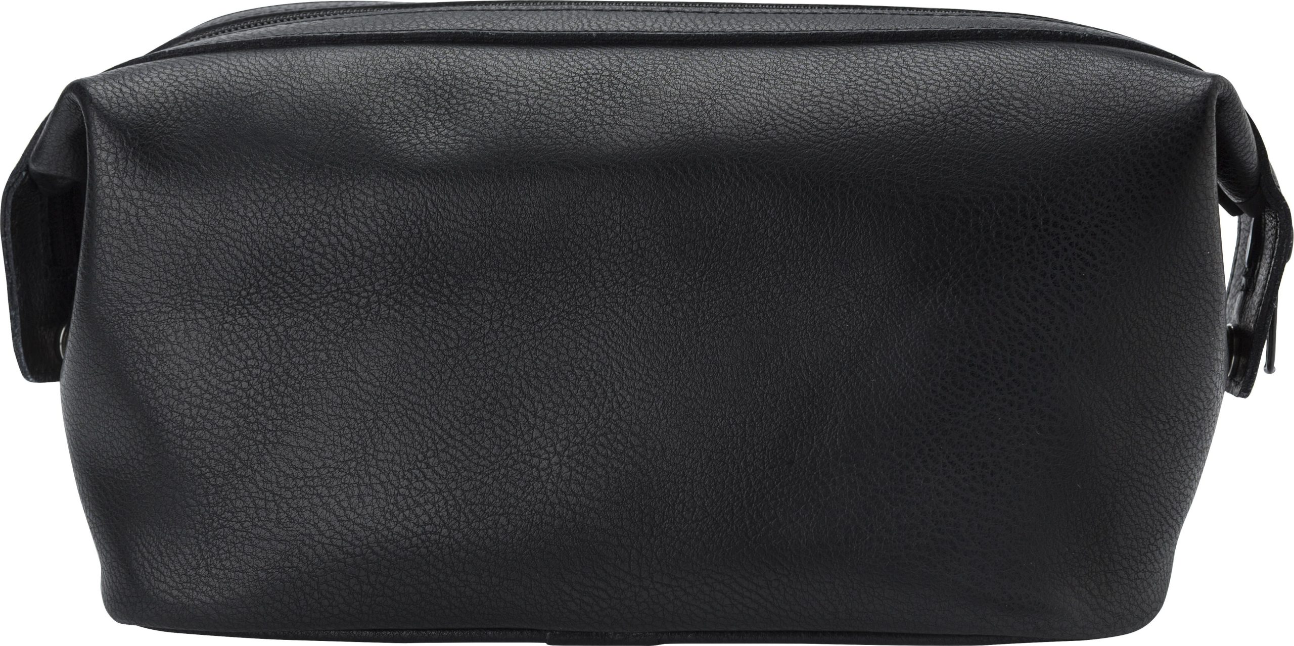 Kožna torbica za toaletni pribor s patentnim zatvaračem. Dva gumba sa strane za stabilizaciju torbice.