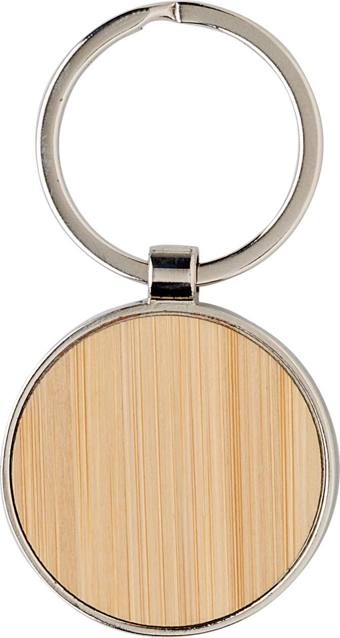 Metalni privjesak za ključeve s prednjom stranom od bambusa. Pakirano u smeđem papirnatom omotu.