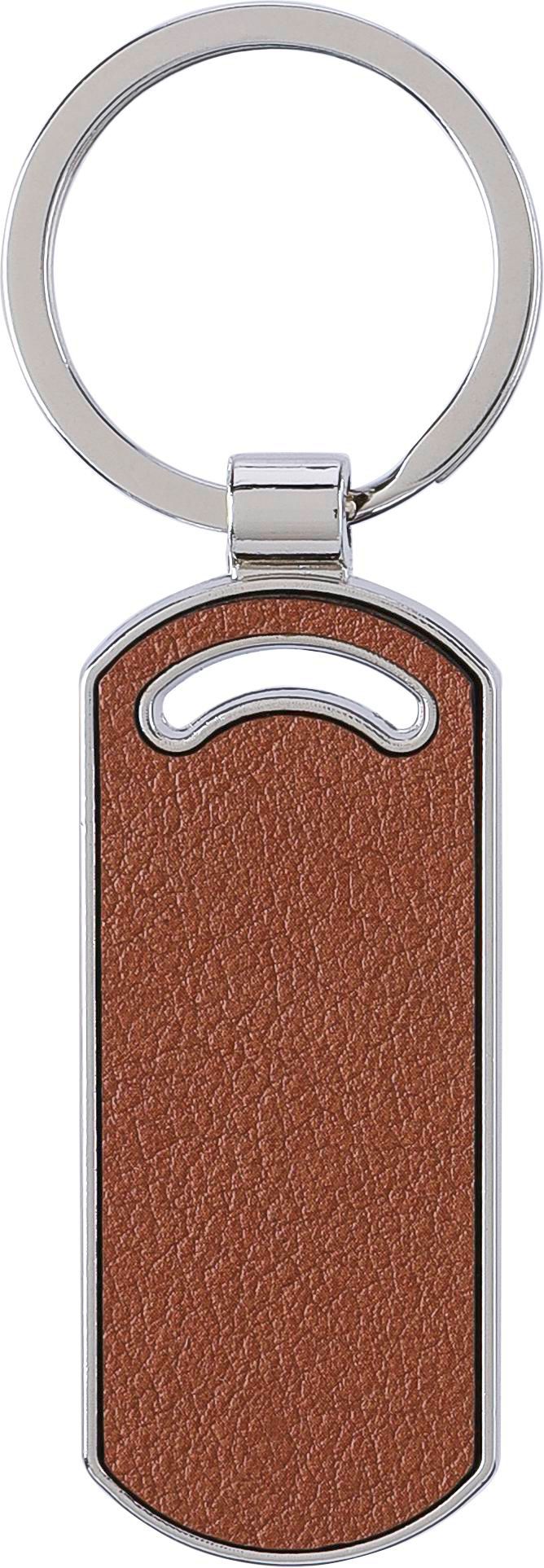 Privjesak za ključeve od reciklirane kože s metalnim prstenom. Ovalnog oblika. Uključuje utisnuti logotip od reciklirane kože sa strane. Pojedinačno pakirano u smeđoj kartonskoj kutiji.