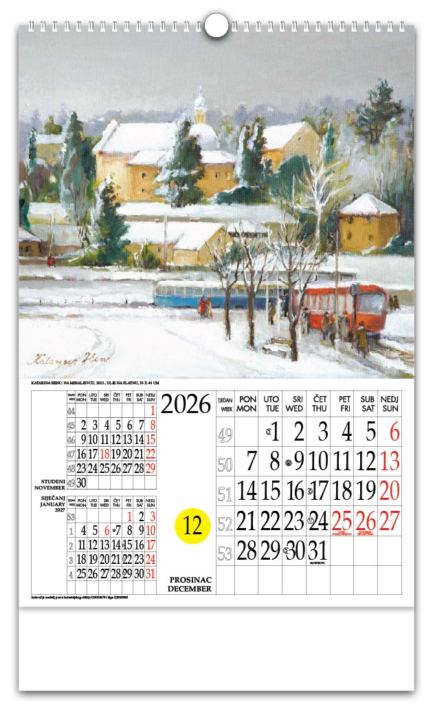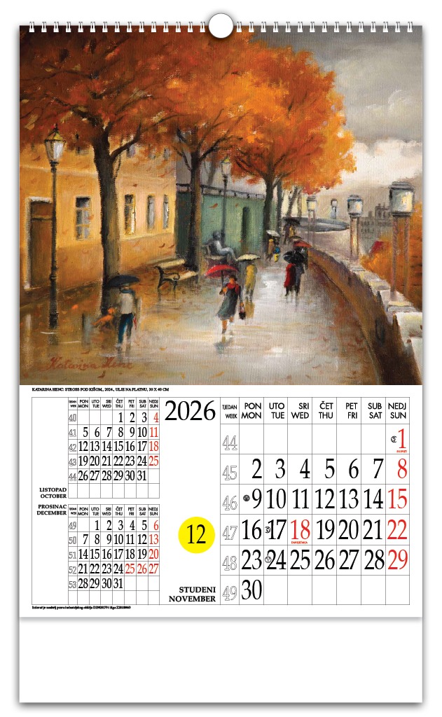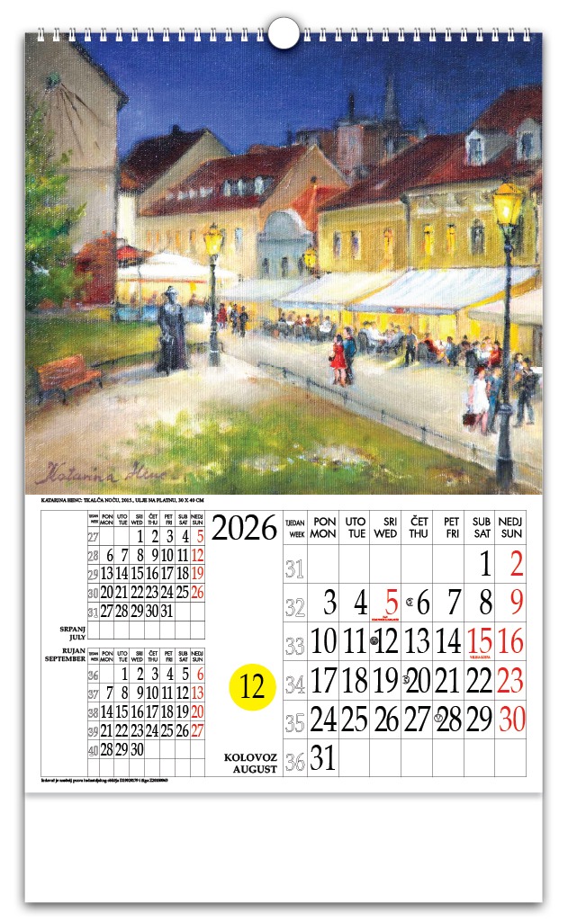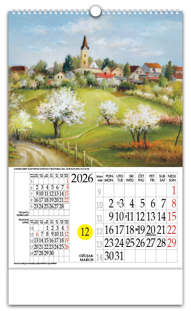 | Opseg | zaštitna folija + predlist + 12 listova + katolički kalendar + štancani krug + podložni karton |