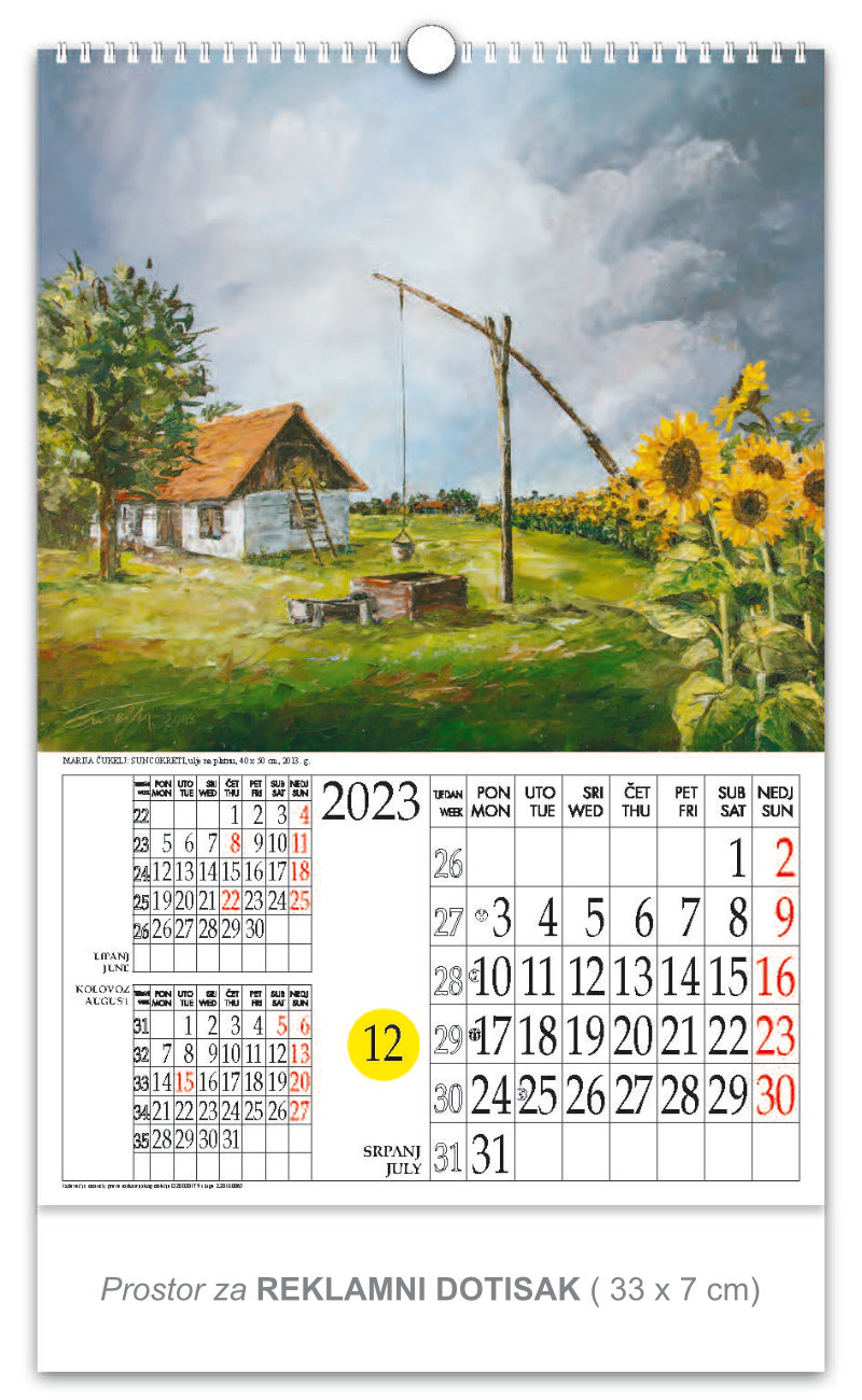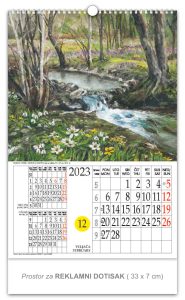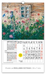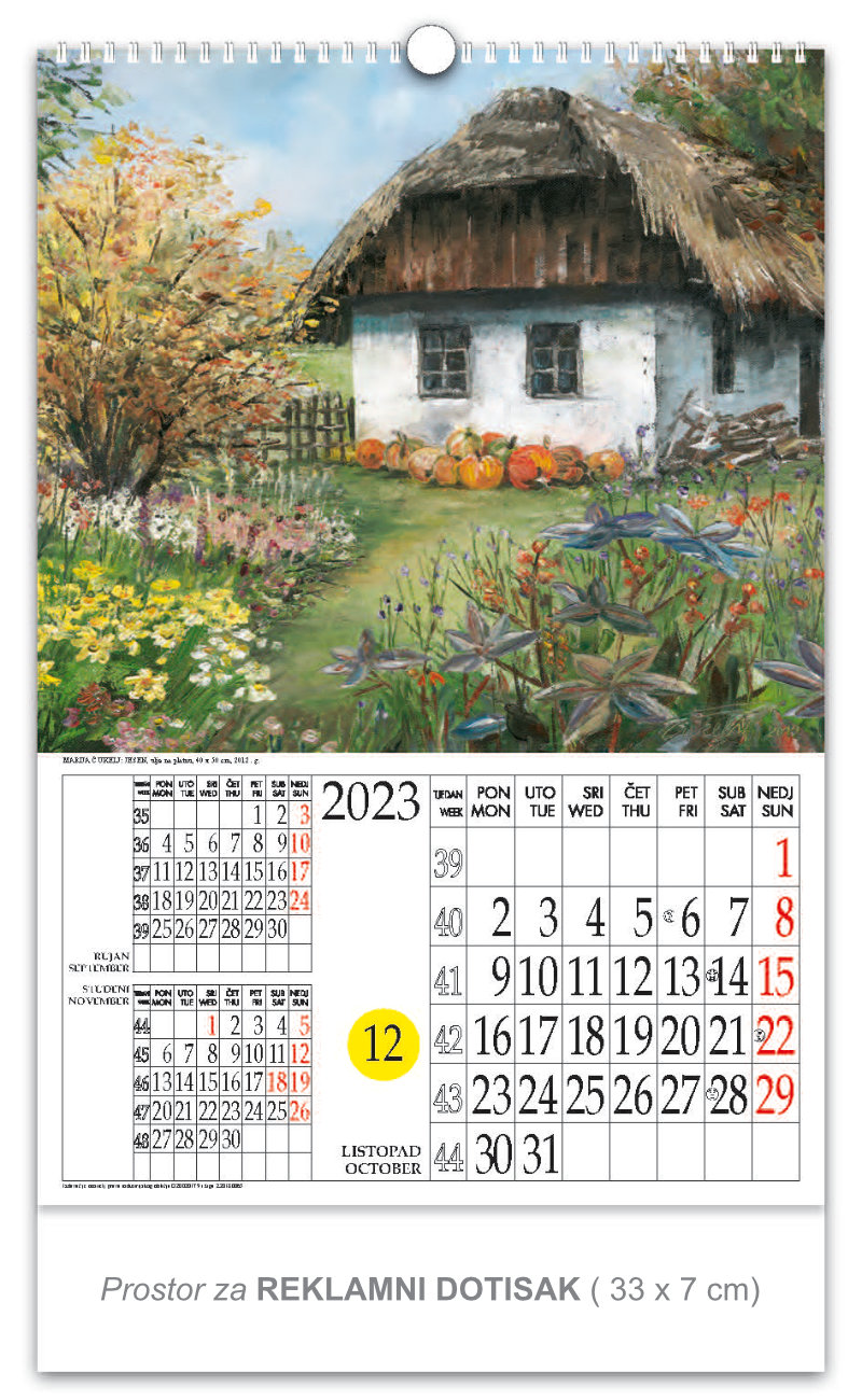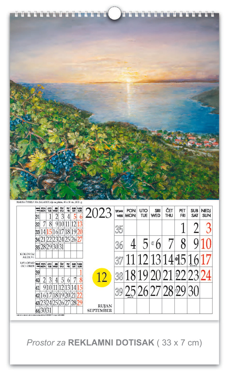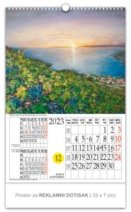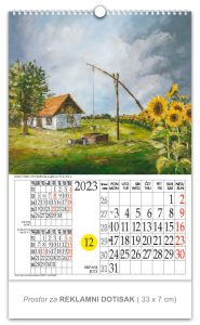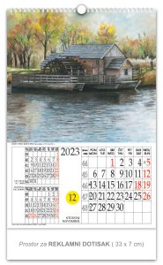 Zidni kalendar s rotacijskim krugomZidni kalendar koji, uz prikaz mjesečnog kalendara, ima istaknuti tekući dan u mjesecu kroz posebno određen otvor na kalendaru i koji se može mijenjati pomicanjem rotacionog brojčanika na poleđini kalendara. Time je aktualni datum u mjesecu posebno istaknut i vidljiv, a promjena datuma je lagana i brza. Zbog svega navedenog, te i poradi pomno odabranih i atraktivnih fotografija sa 4 različitih tema, rotacijski zidni kalendar s rotacijskim krugom jedinstven je i prepoznatljiv na tržištu od 1997.Pokazivač datumaPokazivač datuma je odštancana kružnica na svim listovima kalendara. Laganim pomicanjem datumara, na pokazivaču dobivamo prikaz datuma današnjeg dana.DatumarDatumar je nazubljen krug smješten ispod listova kalendara te prikladnim rješenjem pričvršćen za podlogu. Na svom obodu ima datume cijeloga mjeseca, on svojim kružnim isječkom vrlo malo proviruje na lijevom bočnom bridu kalendara. |