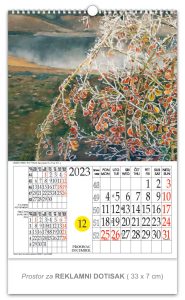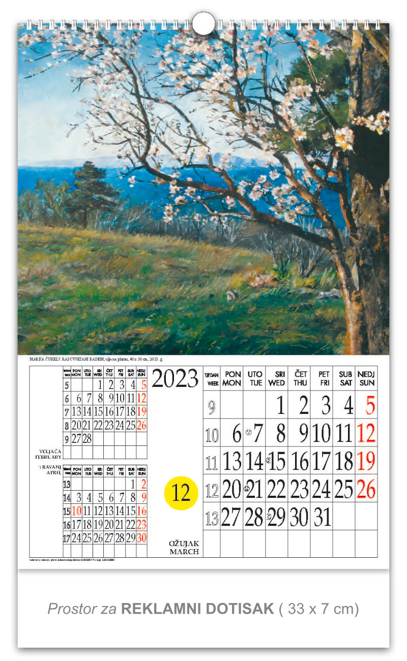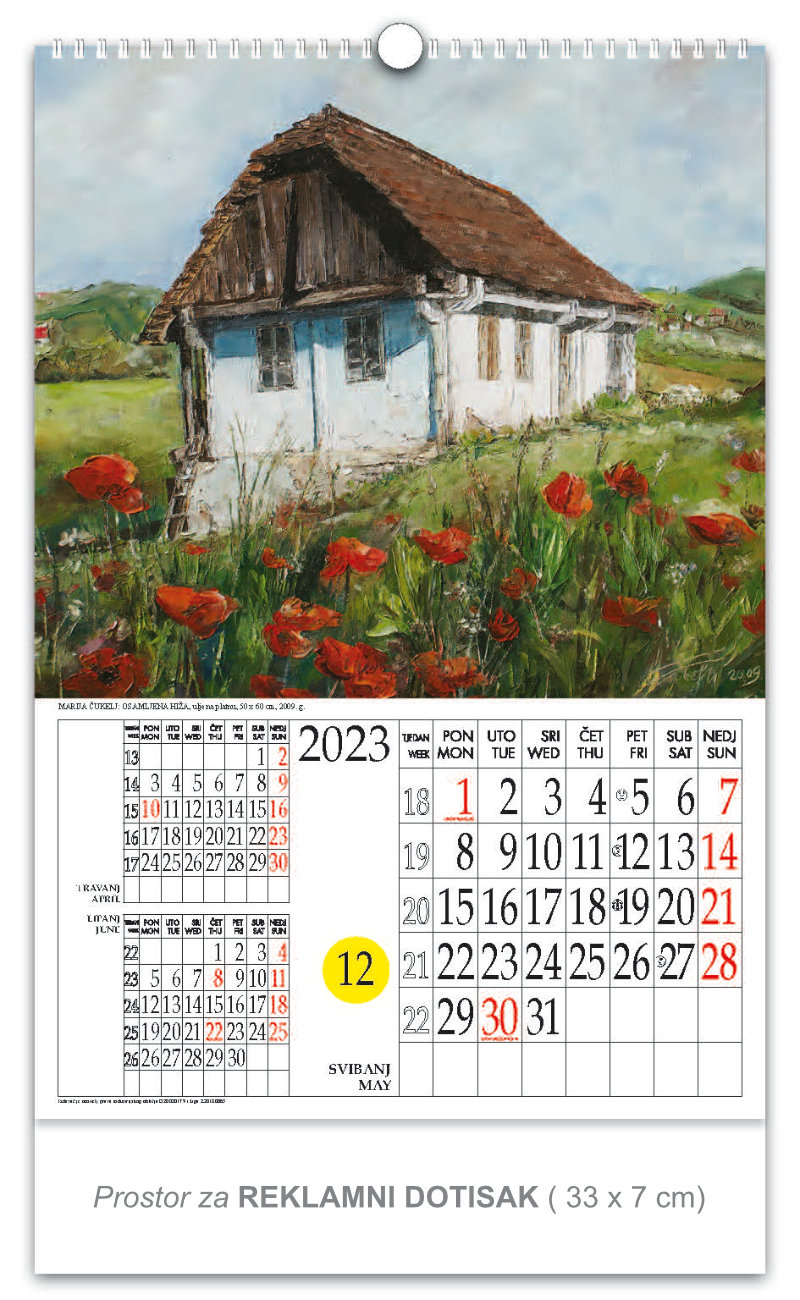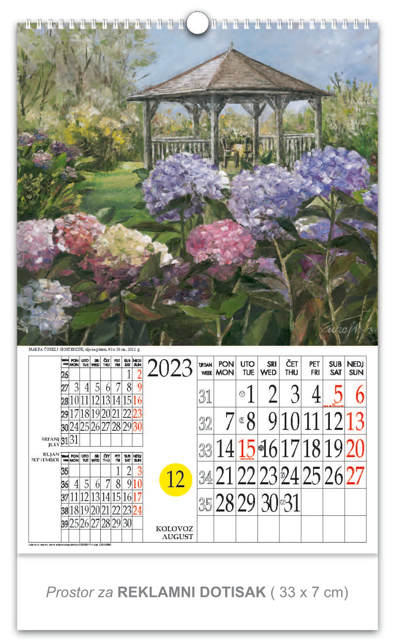 Zidni kalendar s rotacijskim krugomZidni kalendar koji, uz prikaz mjesečnog kalendara, ima istaknuti tekući dan u mjesecu kroz posebno određen otvor na kalendaru i koji se može mijenjati pomicanjem rotacionog brojčanika na poleđini kalendara. Time je aktualni datum u mjesecu posebno istaknut i vidljiv, a promjena datuma je lagana i brza. Zbog svega navedenog, te i poradi pomno odabranih i atraktivnih fotografija sa 4 različitih tema, rotacijski zidni kalendar s rotacijskim krugom jedinstven je i prepoznatljiv na tržištu od 1997.Pokazivač datumaPokazivač datuma je odštancana kružnica na svim listovima kalendara. Laganim pomicanjem datumara, na pokazivaču dobivamo prikaz datuma današnjeg dana.DatumarDatumar je nazubljen krug smješten ispod listova kalendara te prikladnim rješenjem pričvršćen za podlogu. Na svom obodu ima datume cijeloga mjeseca, on svojim kružnim isječkom vrlo malo proviruje na lijevom bočnom bridu kalendara. |