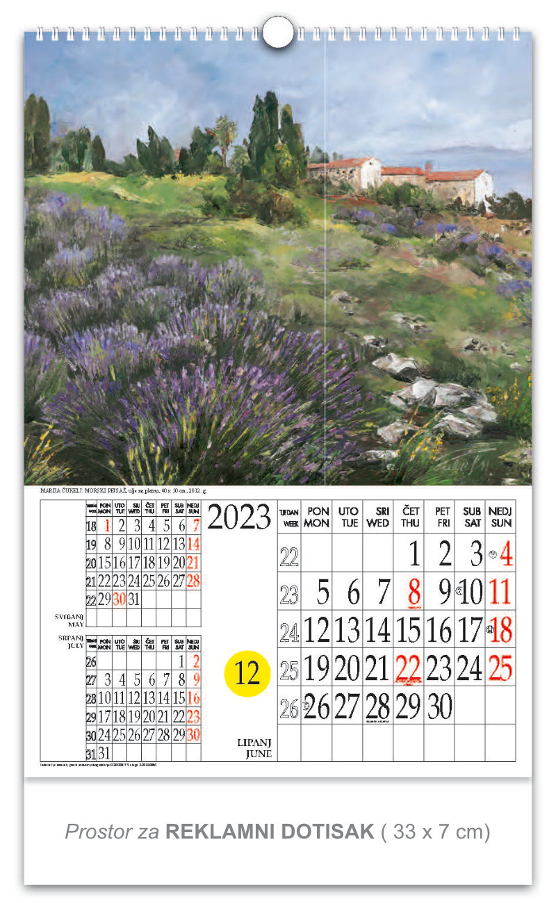 | Opseg | zaštitna folija + predlist + 12 listova + katolički kalendar + štancani krug + podložni karton |
