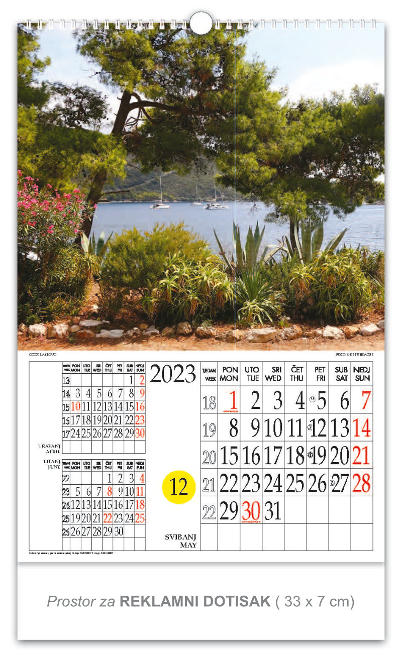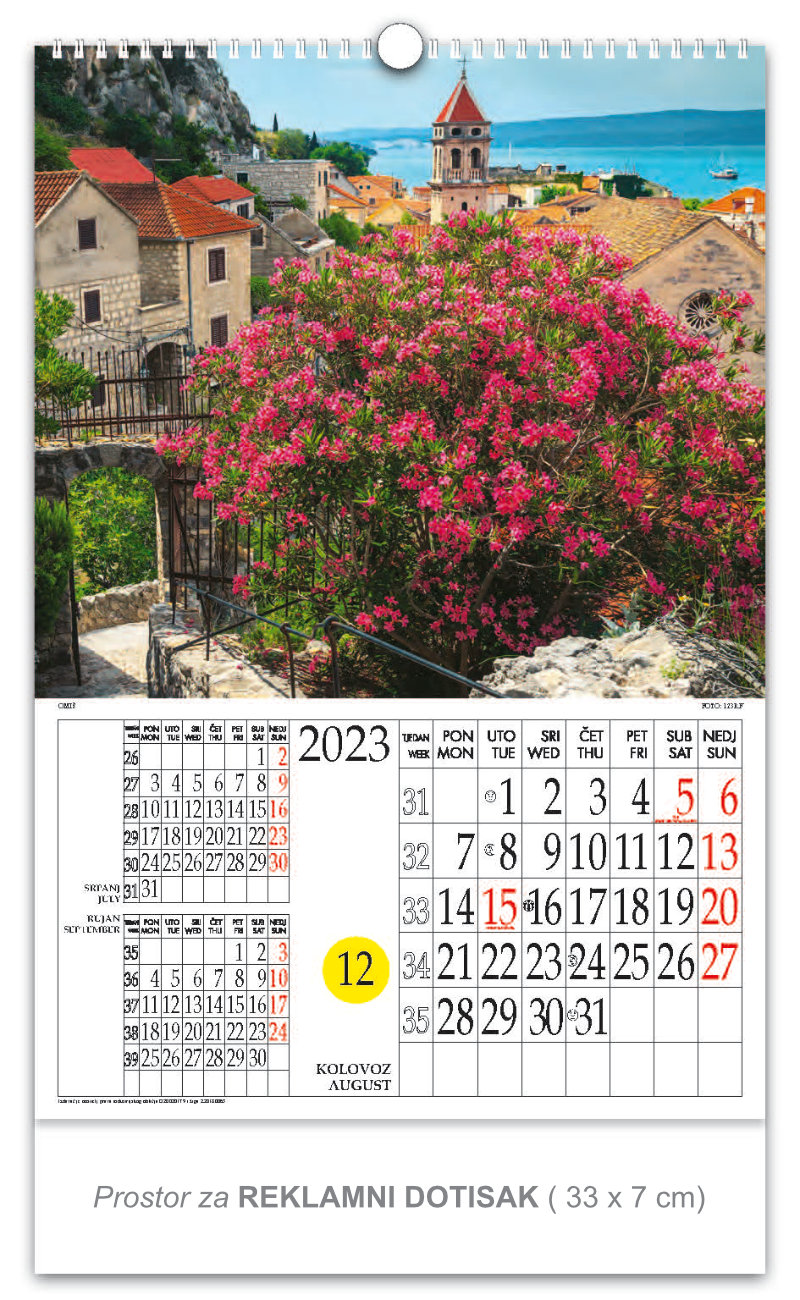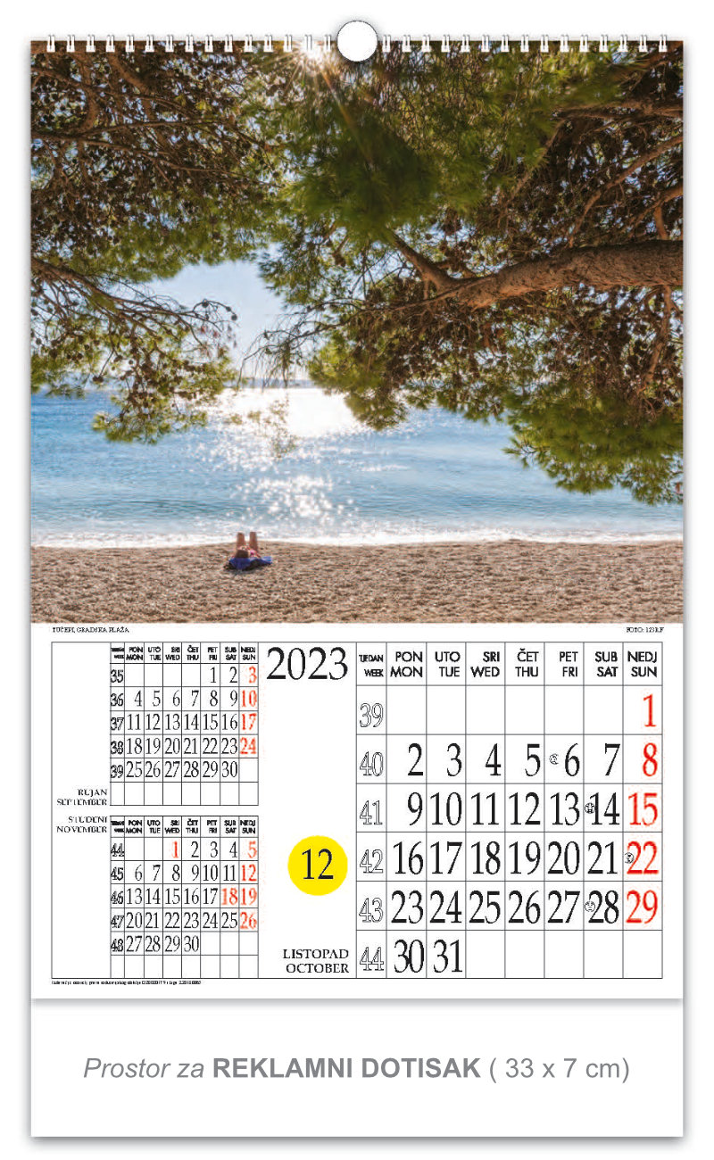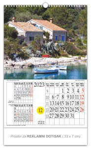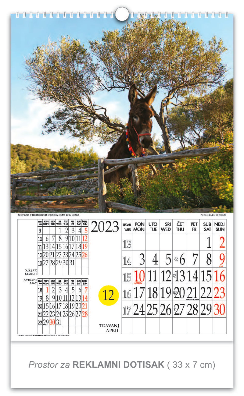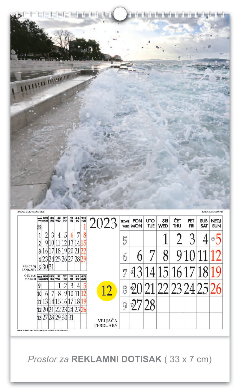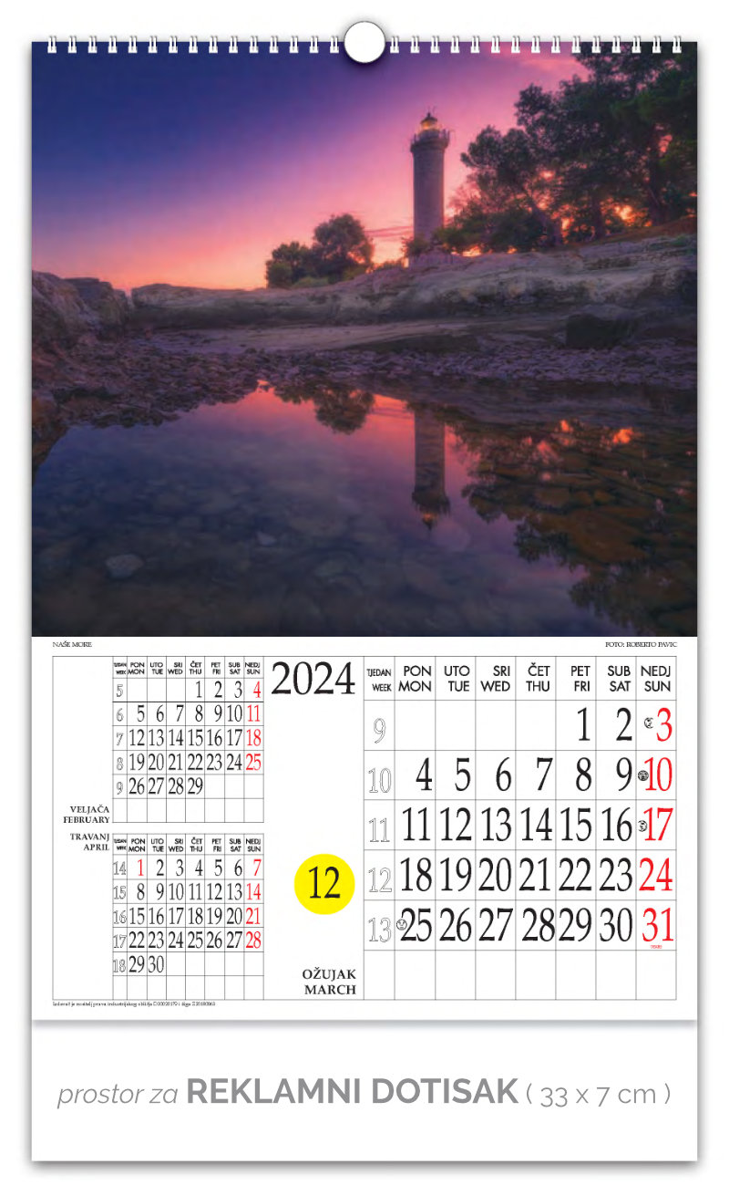 Zidni kalendar s rotacijskim krugomZidni kalendar koji, uz prikaz mjesečnog kalendara, ima istaknuti tekući dan u mjesecu kroz posebno određen otvor na kalendaru i koji se može mijenjati pomicanjem rotacionog brojčanika na poleđini kalendara. Time je aktualni datum u mjesecu posebno istaknut i vidljiv, a promjena datuma je lagana i brza. Zbog svega navedenog, te i poradi pomno odabranih i atraktivnih fotografija sa 4 različitih tema, rotacijski zidni kalendar s rotacijskim krugom jedinstven je i prepoznatljiv na tržištu od 1997.Pokazivač datumaPokazivač datuma je odštancana kružnica na svim listovima kalendara. Laganim pomicanjem datumara, na pokazivaču dobivamo prikaz datuma današnjeg dana.DatumarDatumar je nazubljen krug smješten ispod listova kalendara te prikladnim rješenjem pričvršćen za podlogu. Na svom obodu ima datume cijeloga mjeseca, on svojim kružnim isječkom vrlo malo proviruje na lijevom bočnom bridu kalendara. |