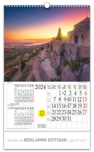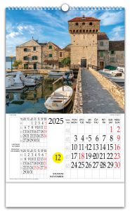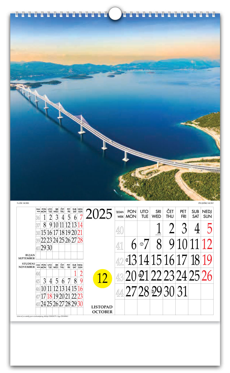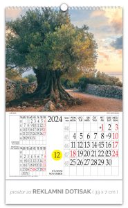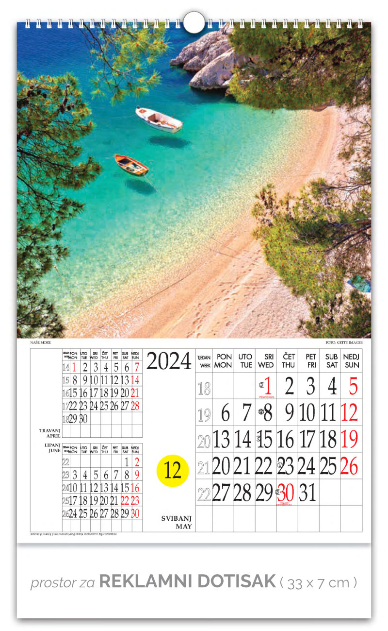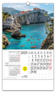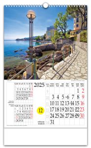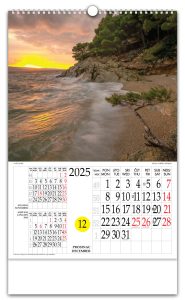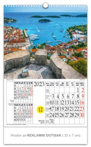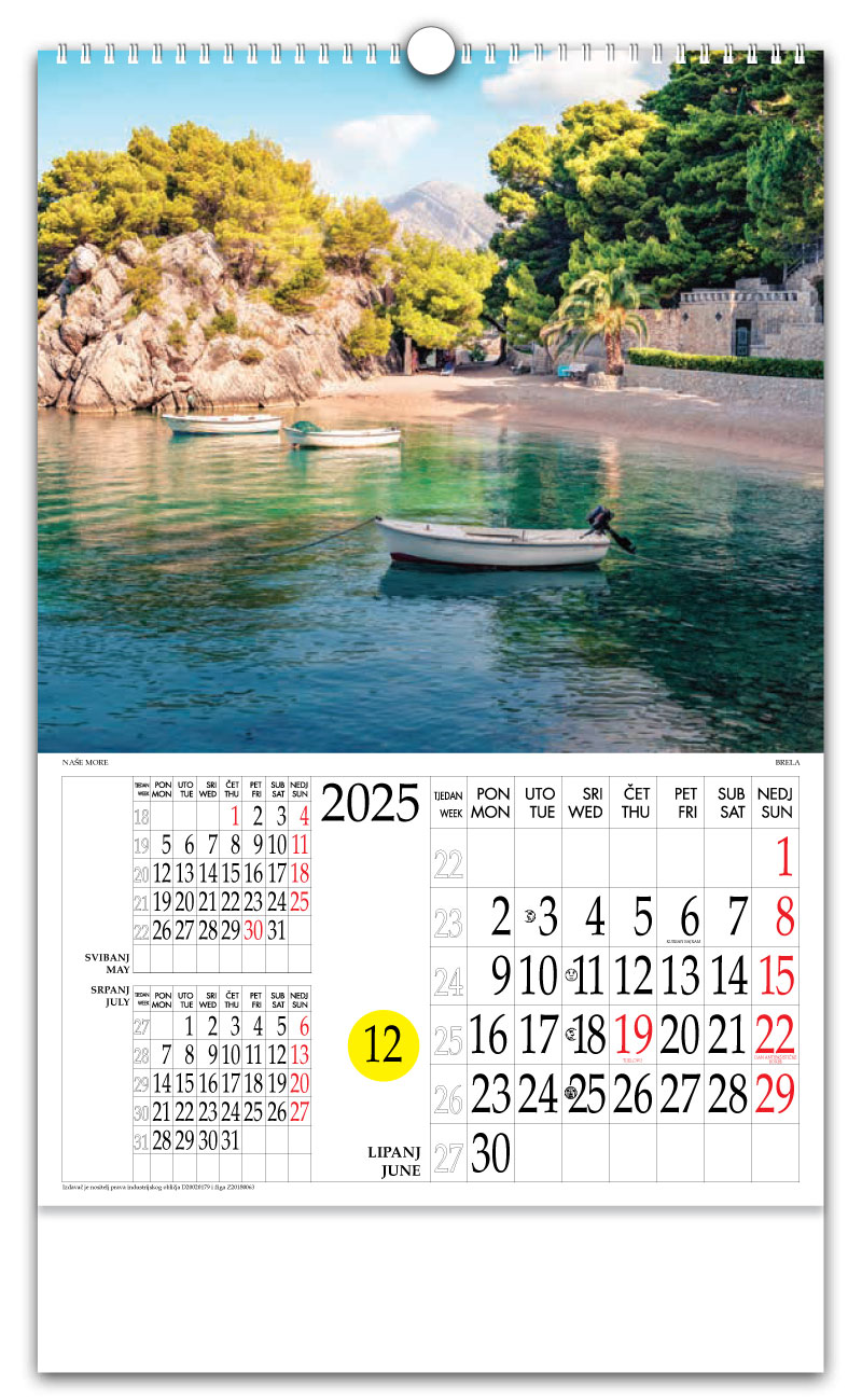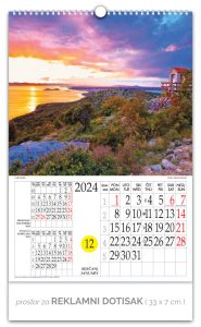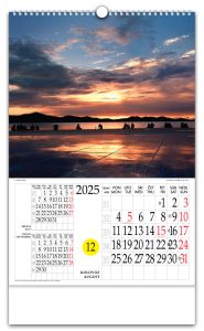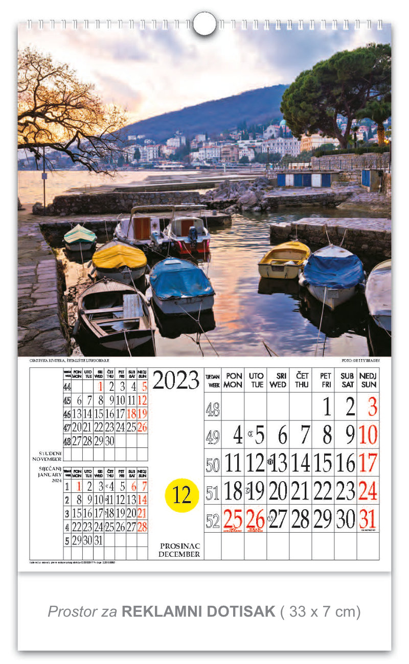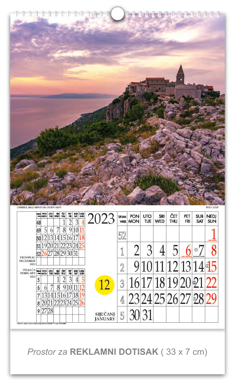 Zidni kalendar s rotacijskim krugomZidni kalendar koji, uz prikaz mjesečnog kalendara, ima istaknuti tekući dan u mjesecu kroz posebno određen otvor na kalendaru i koji se može mijenjati pomicanjem rotacionog brojčanika na poleđini kalendara. Time je aktualni datum u mjesecu posebno istaknut i vidljiv, a promjena datuma je lagana i brza. Zbog svega navedenog, te i poradi pomno odabranih i atraktivnih fotografija sa 4 različitih tema, rotacijski zidni kalendar s rotacijskim krugom jedinstven je i prepoznatljiv na tržištu od 1997.Pokazivač datumaPokazivač datuma je odštancana kružnica na svim listovima kalendara. Laganim pomicanjem datumara, na pokazivaču dobivamo prikaz datuma današnjeg dana.DatumarDatumar je nazubljen krug smješten ispod listova kalendara te prikladnim rješenjem pričvršćen za podlogu. Na svom obodu ima datume cijeloga mjeseca, on svojim kružnim isječkom vrlo malo proviruje na lijevom bočnom bridu kalendara. |