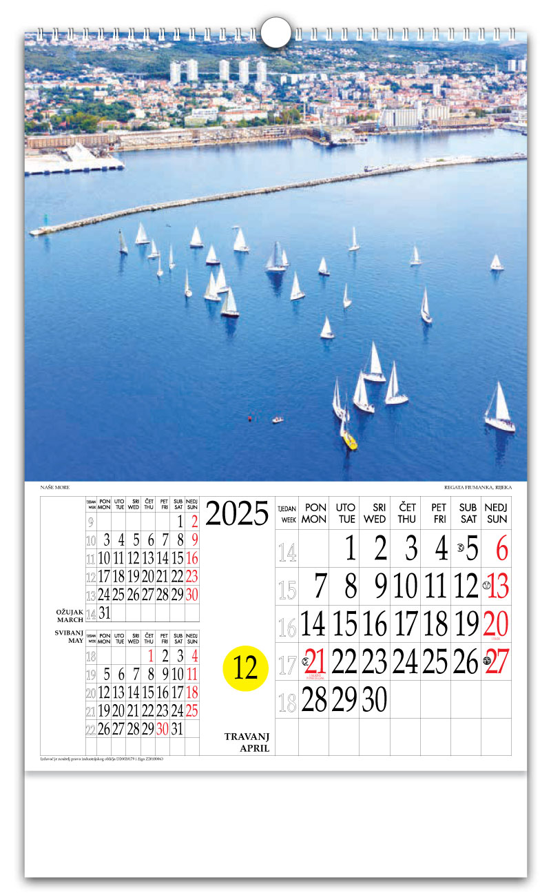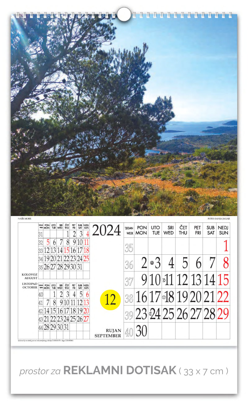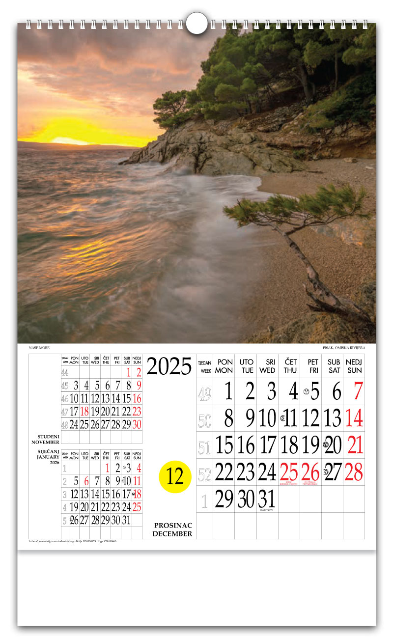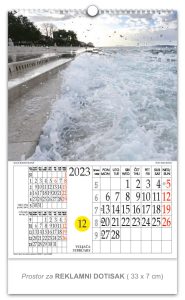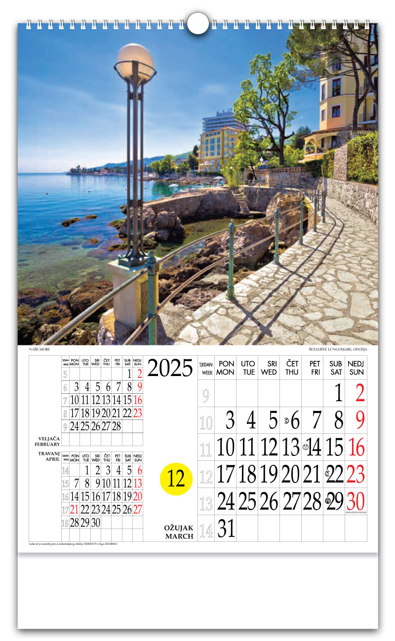 | Opseg | zaštitna folija + predlist + 12 listova + katolički kalendar + štancani krug + podložni karton Kalendar ljekovito bilje + 2 priloga: Kalendar prikaz našeg mora |