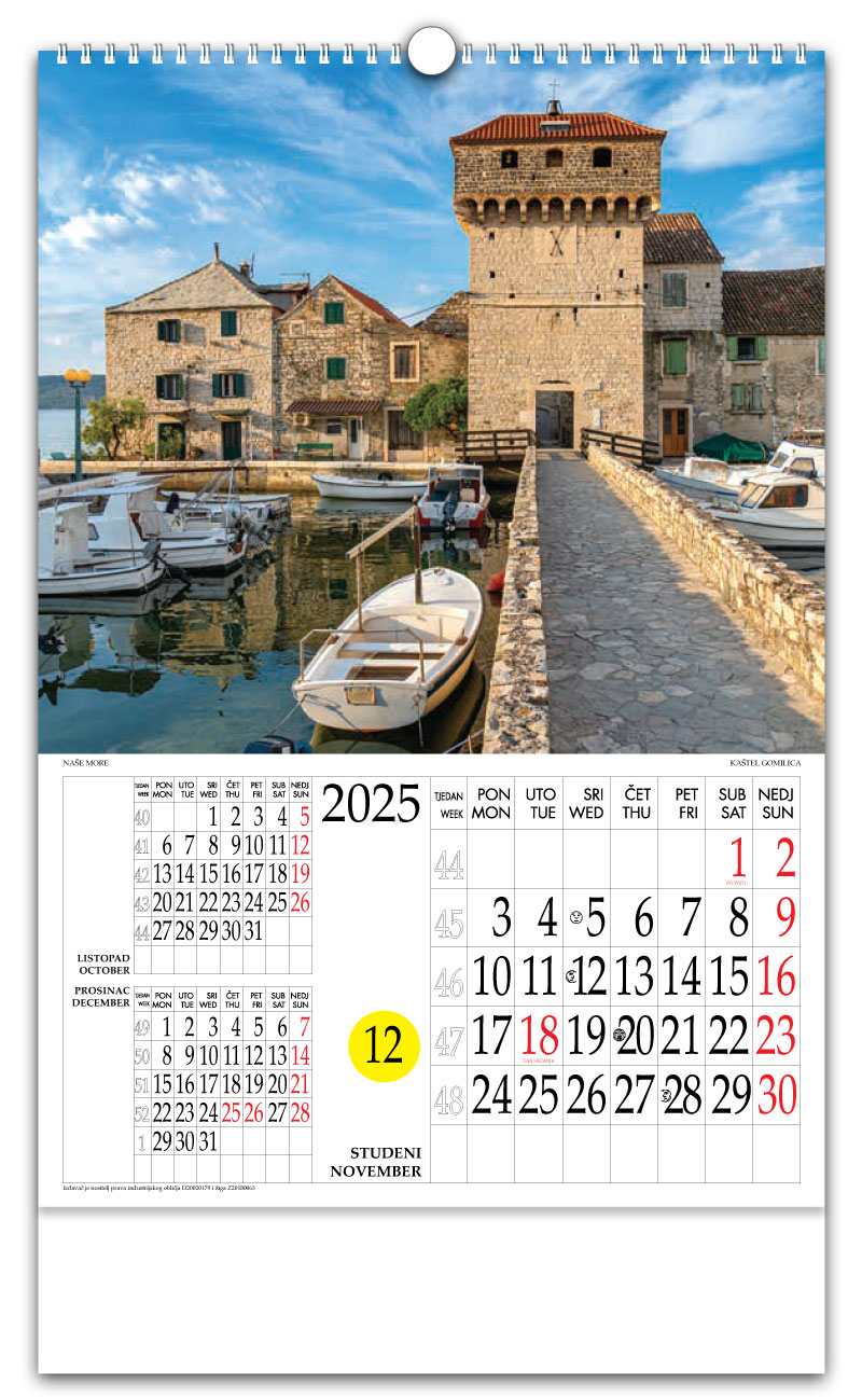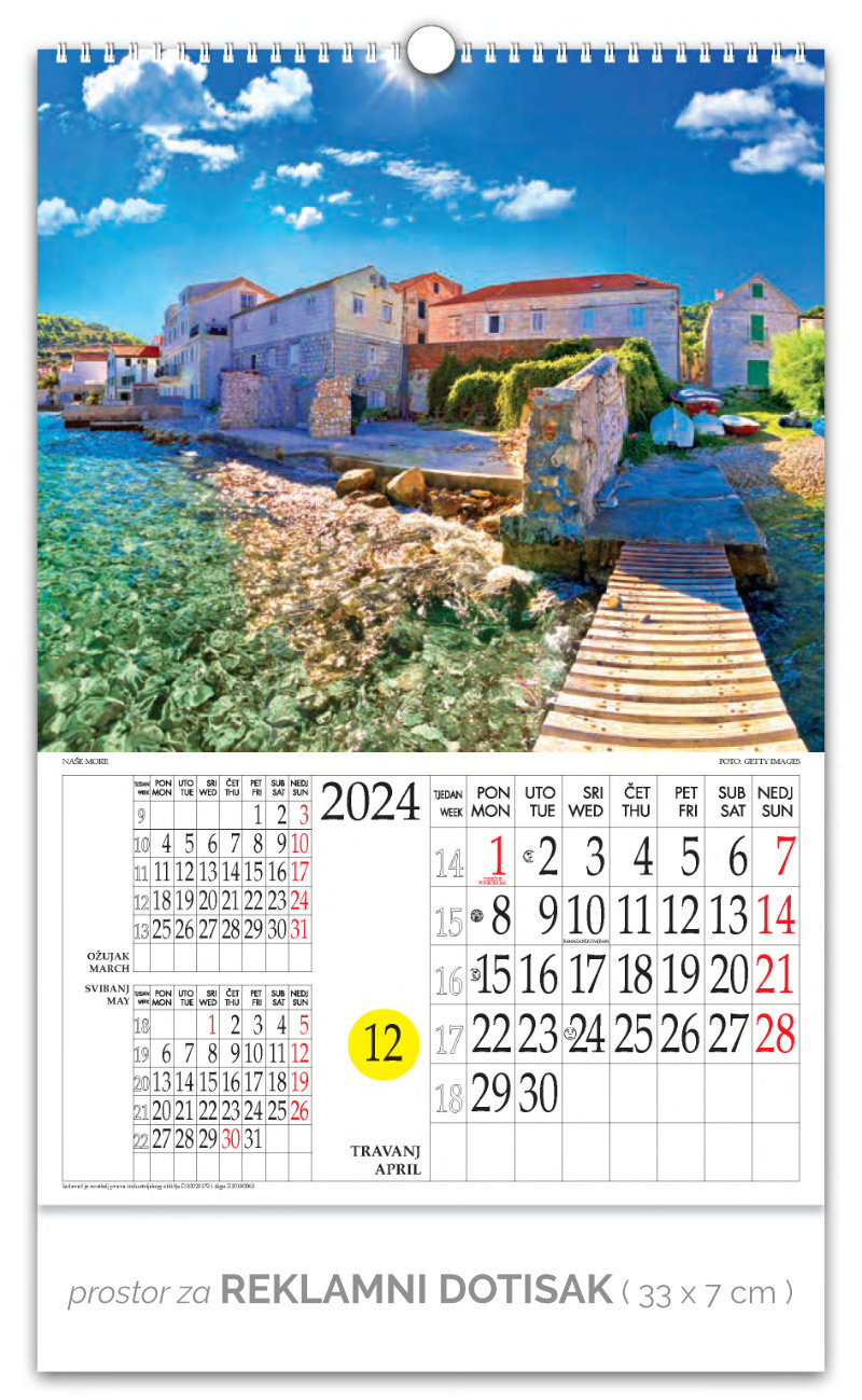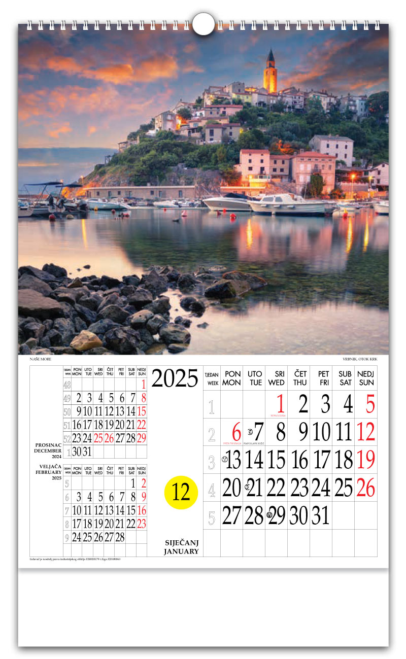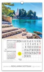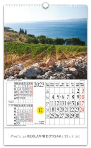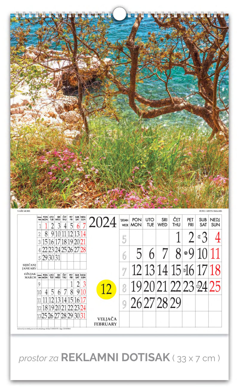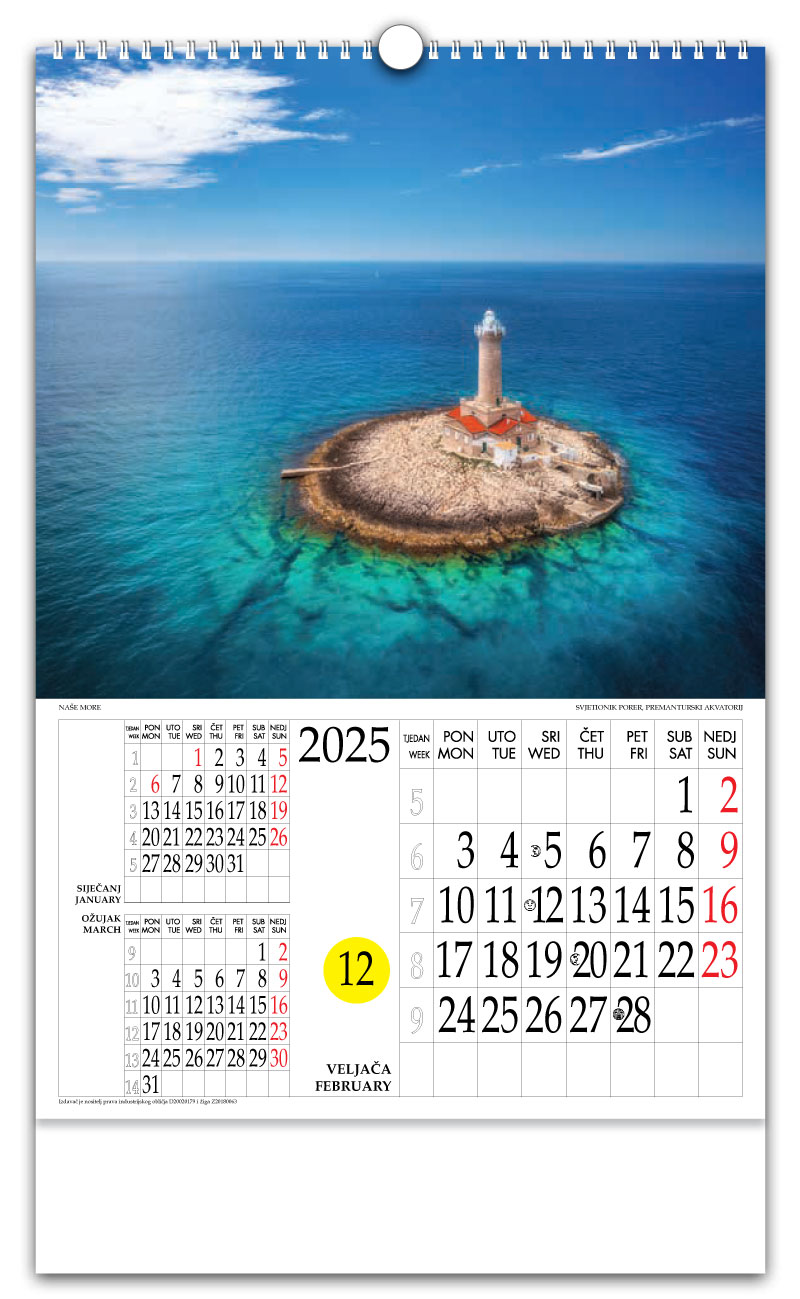 | Opseg | zaštitna folija + predlist + 12 listova + katolički kalendar + štancani krug + podložni karton Kalendar ljekovito bilje + 2 priloga: Kalendar prikaz našeg mora |