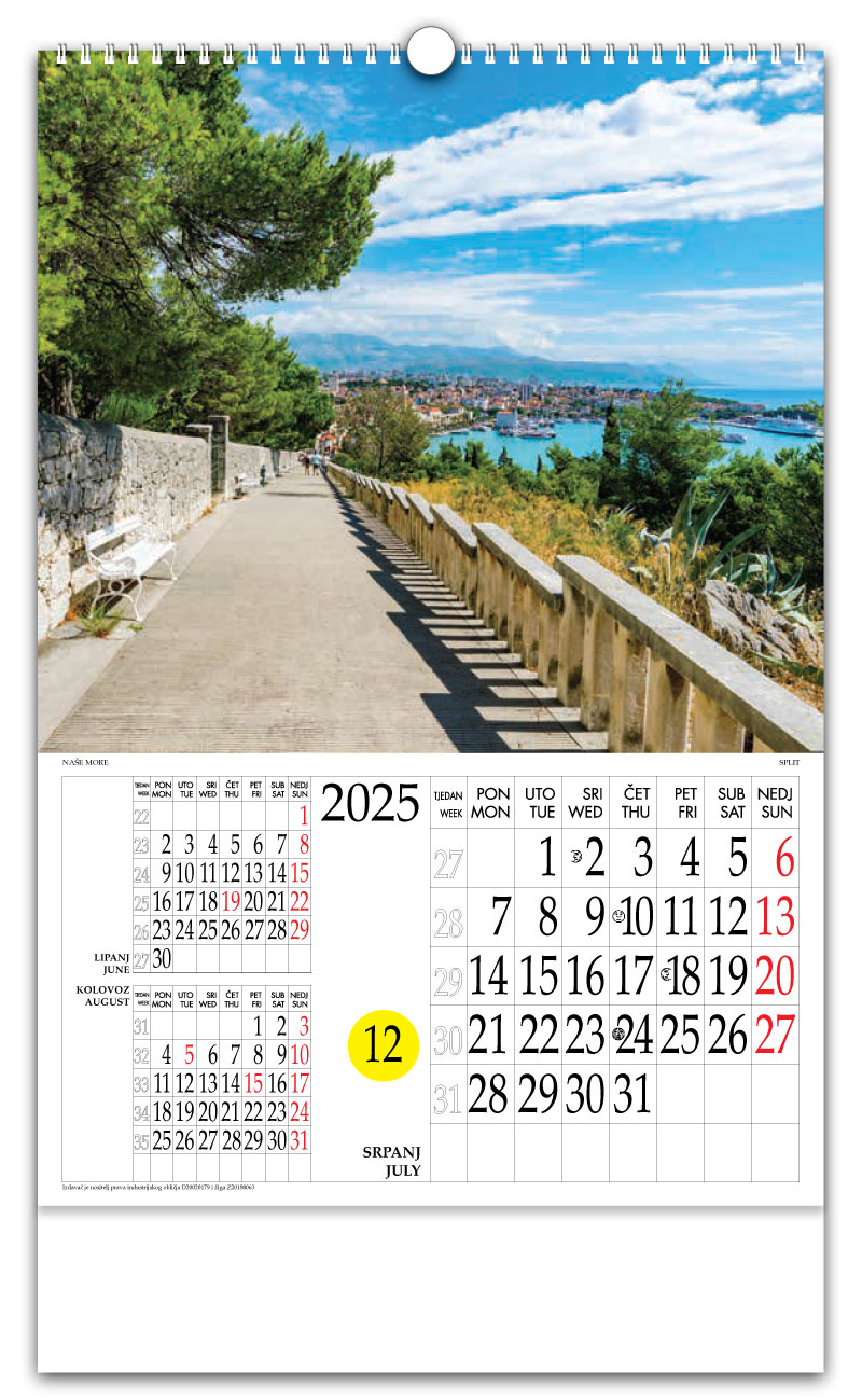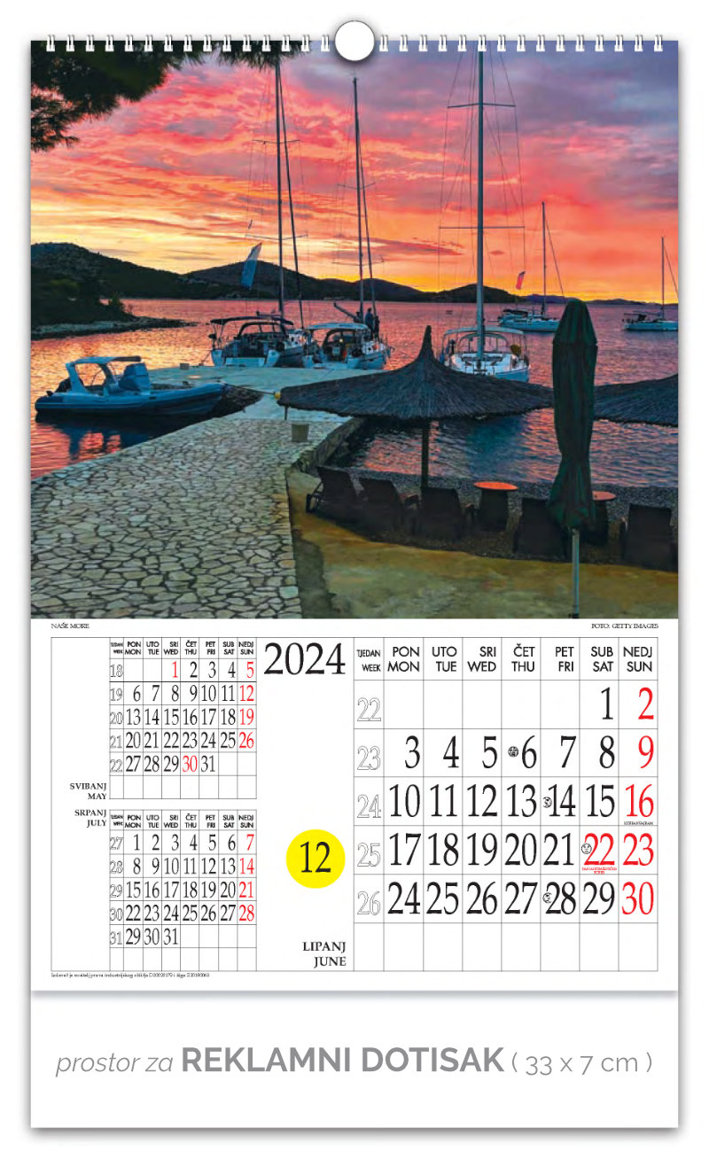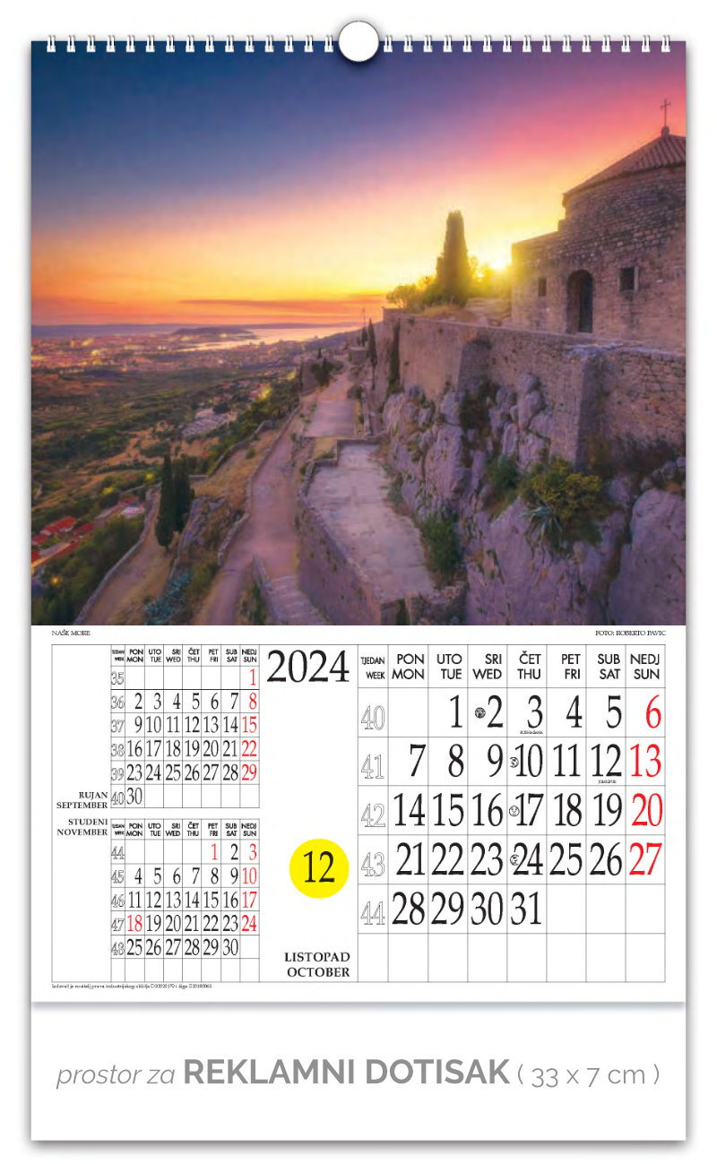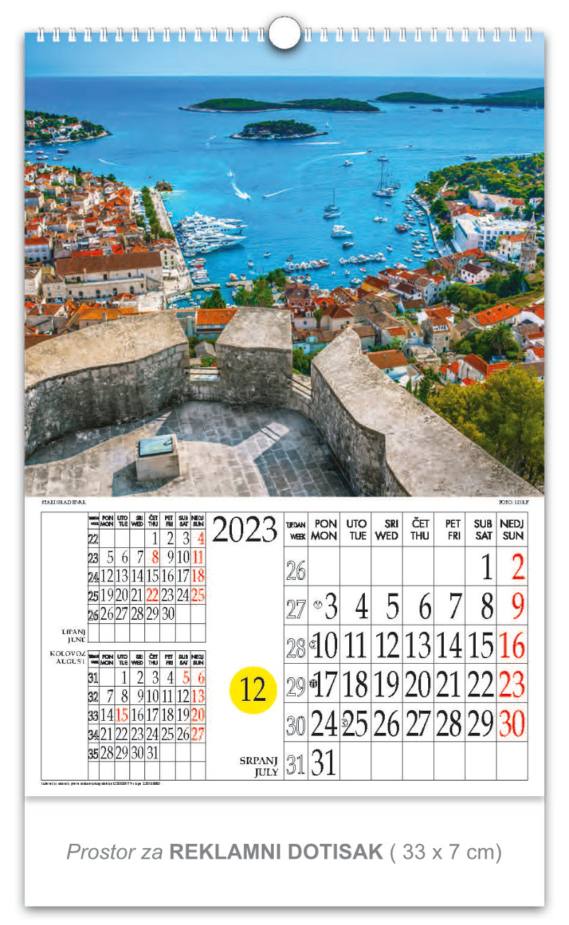 | Opseg | zaštitna folija + predlist + 12 listova + katolički kalendar + štancani krug + podložni karton Kalendar ljekovito bilje + 2 priloga: Kalendar prikaz našeg mora |