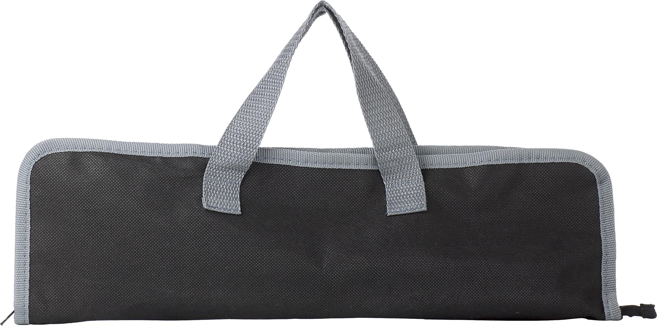 Set alata za roštilj od tri dijela od nehrđajućeg čelika u torbici za nošenje od netkanog materijala. Uključuje: lopaticu, hvataljke i vilicu.