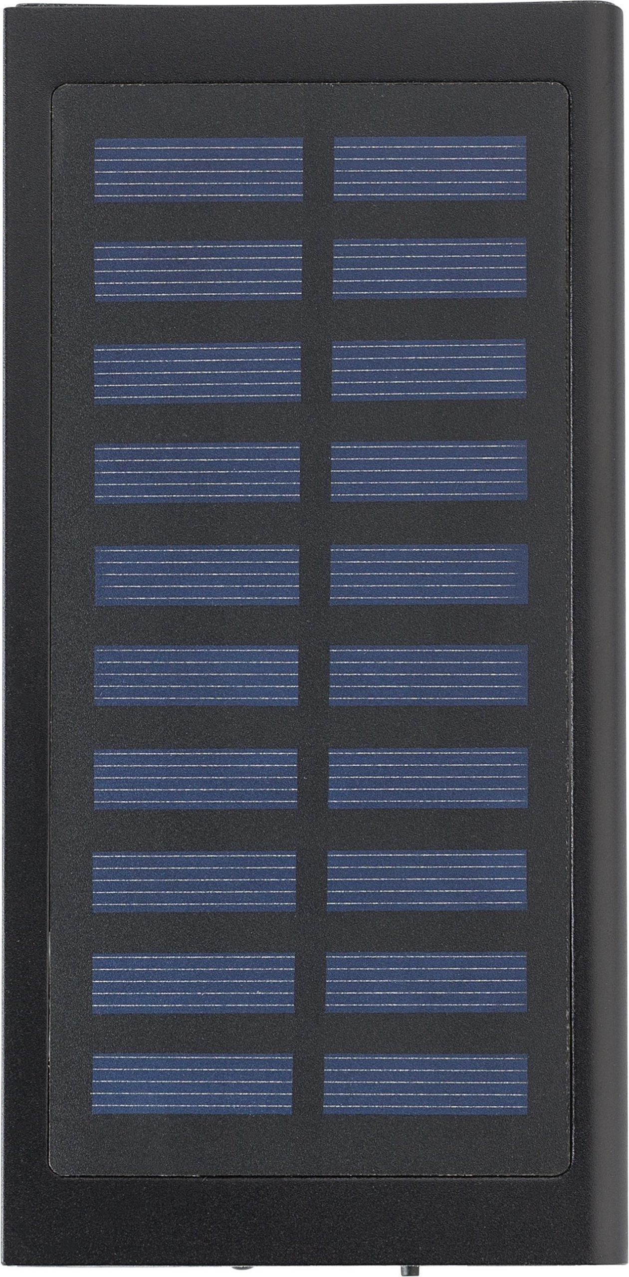 Solarna powerbanka od ABS-a i aluminija, 8.000 mAh. Ulaz DC5V/1A. Izlazni podaci: DC5V / 1A i DC5V / 2.1A. Uključujući kabel (USB – micro USB).