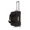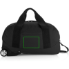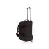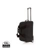 300D high density extra strong fabric. With extendable trolley system, silver coloured wheels and adjustable shoulder strap. One front pocket and one zipper closure main compartment.