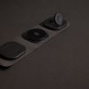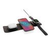 Luxury and foldable 3-in-1 wireless charger made with RCS recycled ABS Total recycled content: 46% based on total item weight. RCS certification ensures a completely certified supply chain of the recycled materials. The wireless charger comes equipped with a magnetic 15W wireless charger and an additional 5W wireless charger suitable for earbuds cases or other small wireless chargeable devices and a 2.5W wireless charger for smartwatches ( Apple watches only). Including RCS certified 120 cm recycled TPE cable. Packed in FSC® mix kraft packaging. Item and accessories 100% PVC free. Input: 9V/3A for optimal use. Output: Phone: 9V/1.1A; 9V/1.67 A/(15W), Earbuds: 5V/1A (5W), Watch: 5V/0.5A.