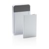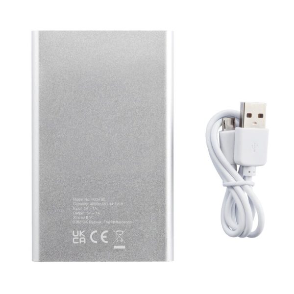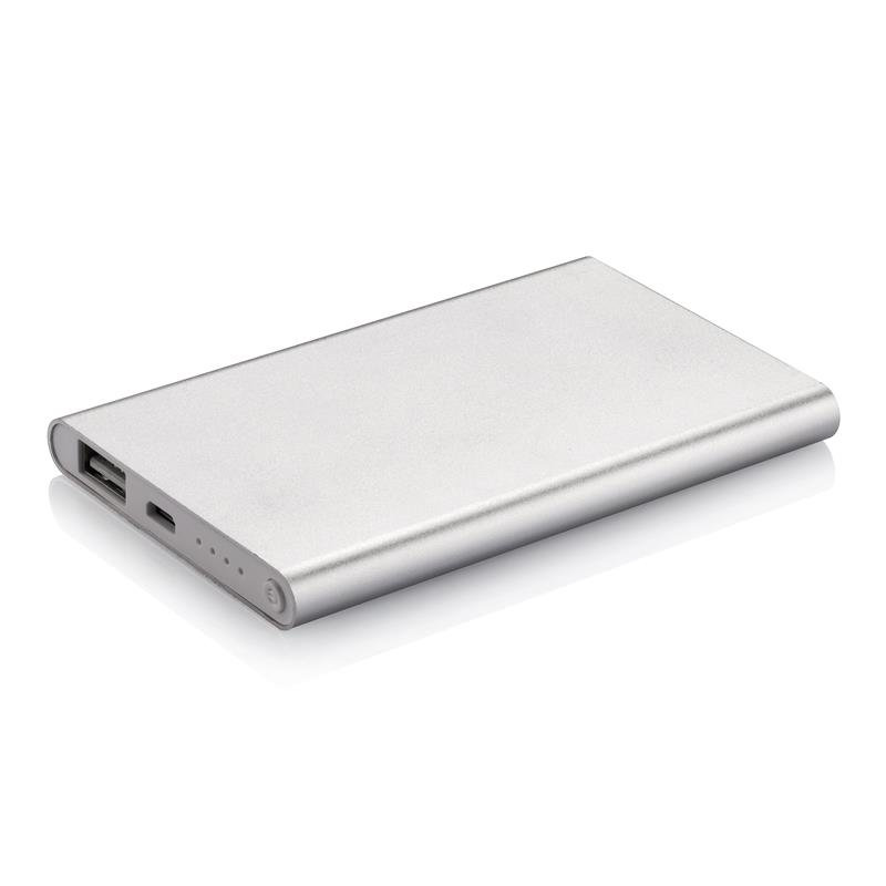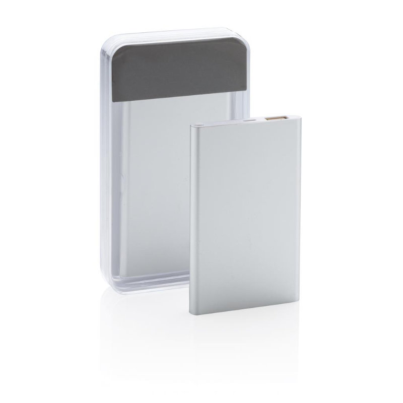 Tanki aluminijski powerbank od 4000 mAh s visokokvalitetnom litij-polimerskom baterijom. Uključujući gumb za uključivanje/isključivanje i indikator preostalog kapaciteta. Pakirano u prozirnu poklon kutiju. Izlaz 5V/1, ulaz 5V/1 A. Uključujući mikro USB kabel.