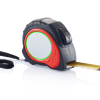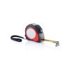 Measuring tape, red ABS case with black rubber grip, black belt clip, black stop button, black end hook with 2 strong magnets, yellow tape, matt silver PVC sticker at case.