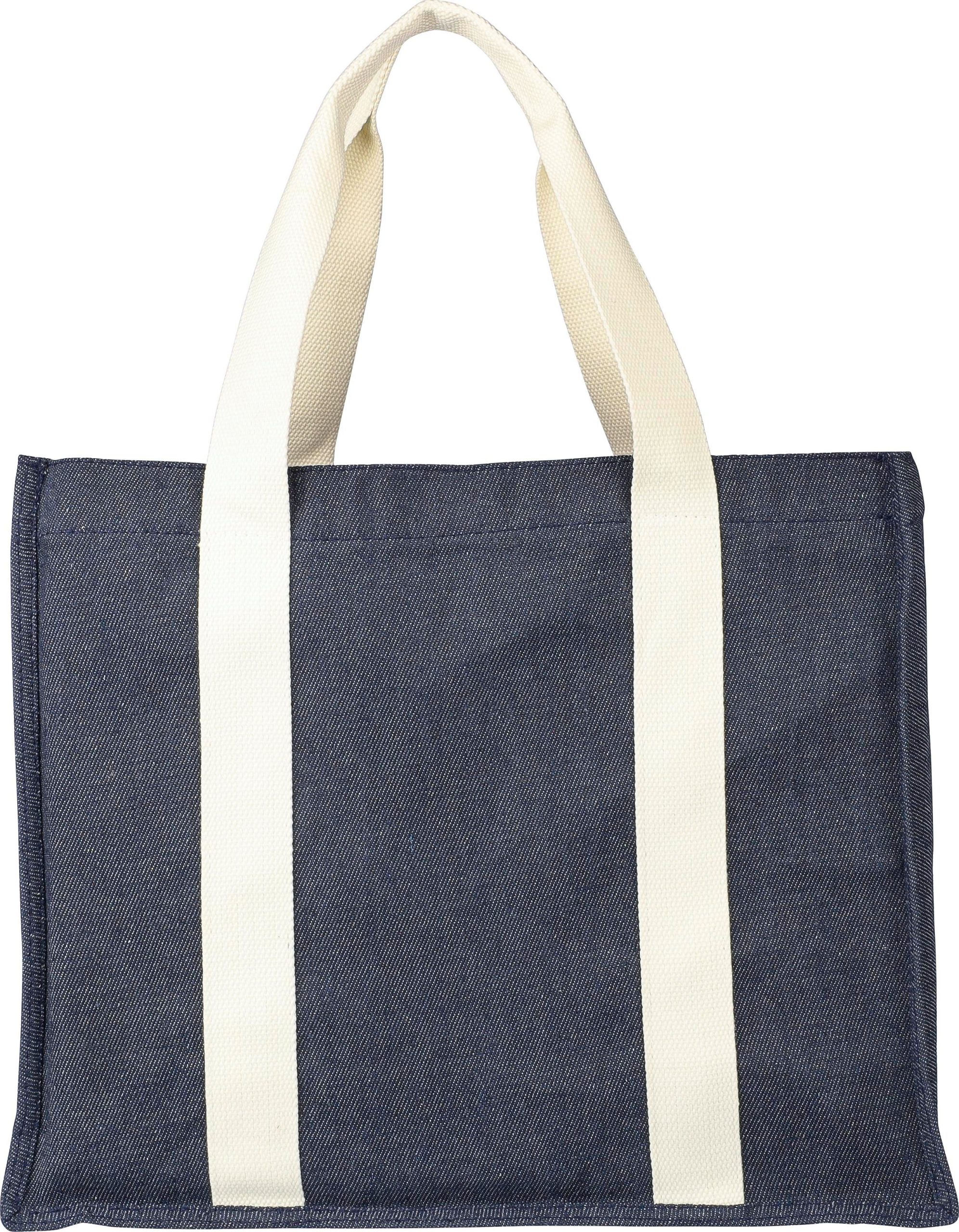 Traper torba za kupovinu (280 g/m²) s umetcima od 15 centimetara i dugim platnenim ručkama (280 g/m²). Traper je izrađen od 65% poliestera i 35% pamuka. Ima jedan gumb za zatvaranje torbe. Postojanost boje trapera je do 2-3 razine.