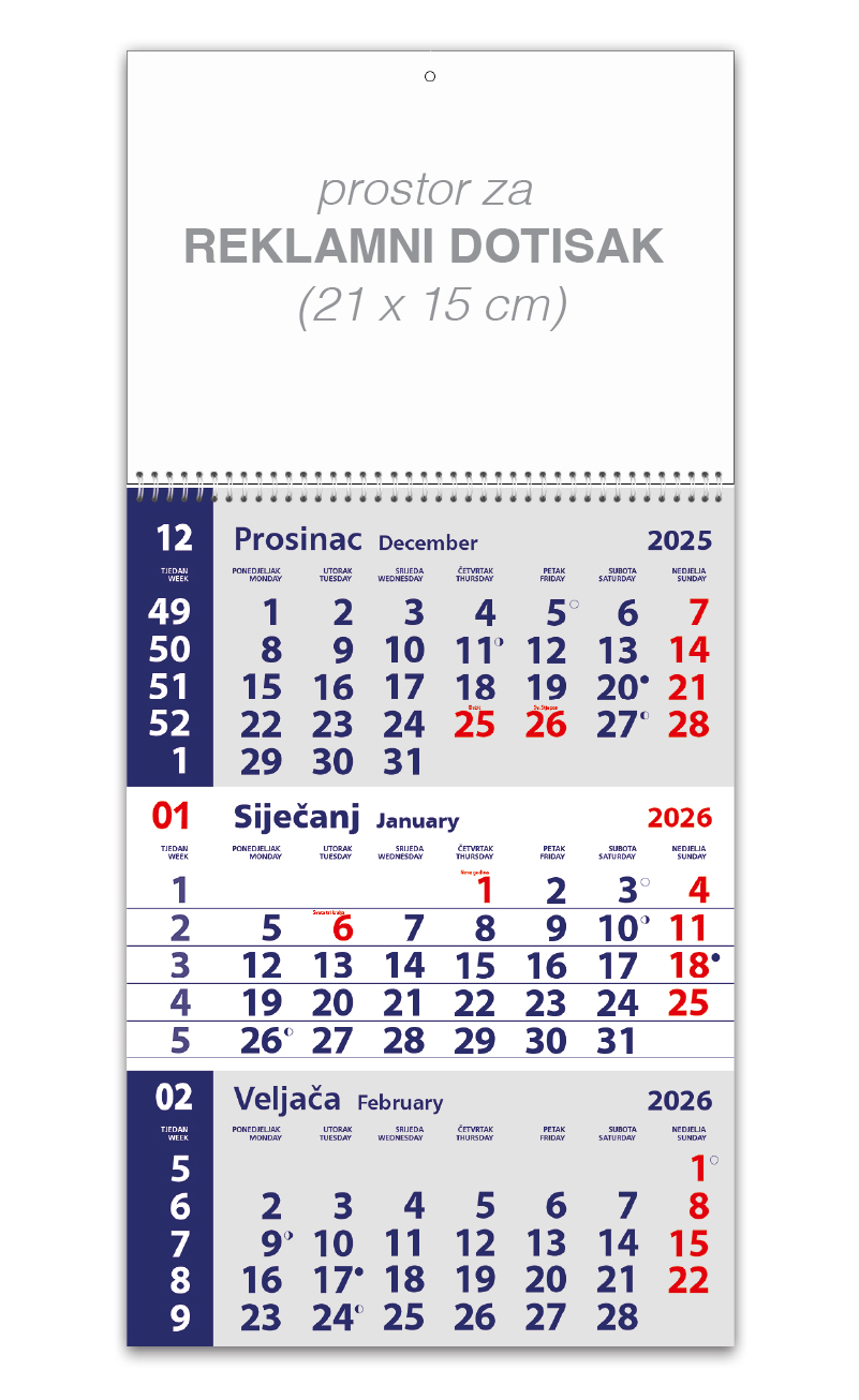 Poslovni kalendari su vrlo funkcionalni, jer na istom listu imamo uvid u prethodni, tekući i naredni mjesec. Razlikujemo poslovne kalendare po tome dali su mjeseci na jednom ili na više odvojenih listova. Postoji više načina obilježavanja datuma: klizač – po kliznoj traci pomičemo obilježavač datuma, jahač – obilježavač datuma umećemo u utor lista kalendara i elektrostatska folija – foliju pomičemo po površini kalendara. Dotisak Vašeg logotipa i/ili vaših podataka na zaglavlje poslovnih kalendara nije uračunat u cijenu, ali smo Vam u mogućnosti ponuditi isto.