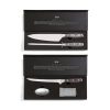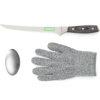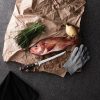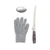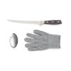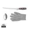 Fish filetting set comprising filleting knife, steel-mesh glove and metal soap. The glove provides extra grip on the fish while protecting you from any mishaps. The metal soap removes odours such as fish and onions that other soaps find hard to shift. The knife is made of X50CrMoV15 German steel with a Pakkawood handle. The easy-grip handle and superb balance in the blade makes the knife comfortable and easy to work with. Size: 21 cm blade.