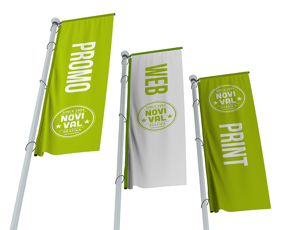 Zastave većih dimenzija uglavnom se izrađuju za vanjske uvjete i idealni su marketinški alat ispred poslovnih prostora. Omogućuje vašem brendu izuzetnu vidljivost. Garantiramo vrhunsku kvalitetu materijala naših zastava, a suvremena tehnologija tiska omogućuje stopostotnu probojnost boje te intenzitet i postojanost.
